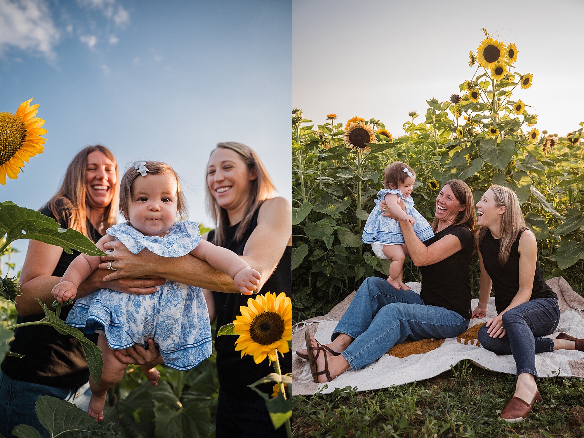 A couple plays with their daughter in a sunflower patch at Oregon Dairy in Lancaster, PA.